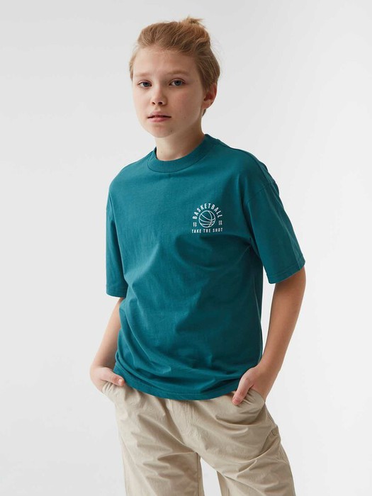 Футболка оверсайз силуэта с небольшим контрастным принтом в виде надписи спереди BASKETBALL TAKE THE SHOT (с англ. «баскетбол сделай бросок») и большим тематическим принтом на спине в баскетбольной эстетике. Мягкий трикотаж из 100% хлопка. Свободный крой со спущенным плечом. Круглый вырез горловины и короткий рукав. Популярный крой оверсайз и спущенная линия плеч позволяет чувствовать себя свободно. Размерный ряд 116 – 176 см.