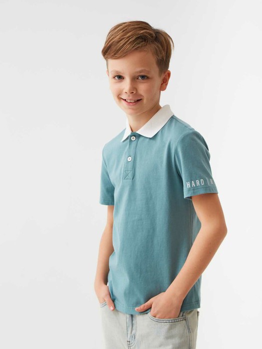 Трикотажное поло с короткими рукавами. Мягкий фактурный трикотаж из 100% хлопка. Классический прямой крой, отложной воротник, планка на двух пуговицах. Воротник и пуговицы белого контрастного цвета. На левом рукаве контрастный принт PLAY HARD/WIN EASY(с англ. «играй усердно/выигрывай легко»). Размерный ряд 128 – 176 см.