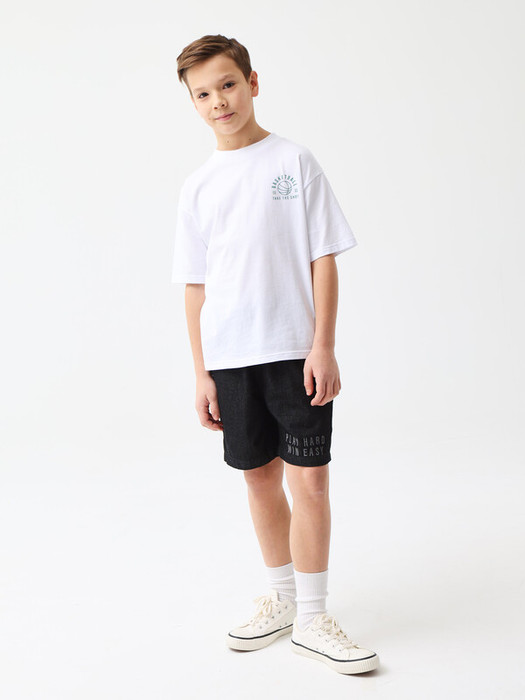 Удлиненные джинсовые шорты прямого кроя. Легкий деним 5 унций из 100% хлопка. Средняя посадка с широким поясом на резинке, боковые карманы. По поясу расположен рулик в качестве завязки, что добавляет комфорта в носке. По низу нанесен принт «Playhardwineasy». Представлены в двух цветах – синий и серый. Размерный ряд 128 – 176 см.