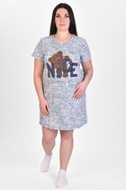 Светлая сорочка из вискозы. Короткие рукава, черная окантовка горловины, внизу сбоку разрез с бантиком. Принт в виде чашки кофе, цветов и надписей, короткие рукава. Длина до середины бедра. Размеры от 42 до 60. Есть розница.
