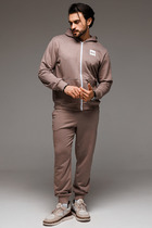 Брюки мужские из хлопкового трикотажа прямого силуэта. Пояс притачной регулируется шнуром. Карманы на молниях, с листочками.
