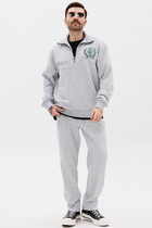 Брюки мужские из хлопкового трикотажного полотна прямого силуэта. На передних половинках карманы в рамку на молнии. Пояс по талии регулируется шнурком. Под карманом на правой половинке настрочен шеврон с фирменным
