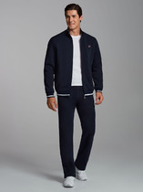 Спортивный костюм из полиэстеровой ткани с изнаночным начесом, в стиле ретро спорт. Куртка свободного силуэта на поясе, воротник - стойка, куртка застегивается на молнию. Карманы куртки и брюк прорезные с планками, с молниями. Рукава покроя реглан. По груди куртки настрочены контрасные полосы. Посадку по фигуре обеспечивает декоративная трикотажная резинка с полосками. Брюки прямого силуэта. Пояс по линии талии дополнительно регулируется шнурком.
