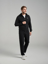 Спортивный костюм из хлопкового трикотажного полотна. Кокетки на куртке выполнены из ткани контрастного цвета. В швах притачивания кокеток проложен кант белого цвета. Карманы на куртке и брюках прорезные с листочками на молнии. Листочки выполнены из полотна контрастного цвета с белыми кантами. Посадку по фигуре обеспечивает эластичная рибана по воротнику, поясу и манжетам. Брюки прямые с накладным карманом на задней половинке. Пояс по линии талии регулируется шнурком. На брюках и полочке настрочен шеврон с фирменным логотипом.
