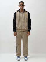 Спортивный костюм из хлопкового трикотажного полотна. Куртка костюма на поясе, с воротником-стойкой, с легким капюшоном, застегивается на молнию. Рукава втачные. Несколько деталей костюма изготовлены из водонепроницаемой плащевой ткани в тон изделия - это капюшон, вставки рукавов, переходящие в плечевые кокетки, бочки куртки, боковые вставки брюк. Ветрозащитная планка из плащевой ткани закрывает молнию. Все карманы комплекта застегиваюся на молнии и расположены в швах боковых деталей, Лицевая часть капюшона регулиреутся резиновым шнуром с помощью металлических фиксаторов.Пояс, воротник и манжеты куртки изготовлены из эластичного подвяза. Брюки прямые, зауженные книзу. Пояс брюк по линии талии с эластичной резинкой так же дополнительно регулируется шнуром. На левой груди и под левым карманом брюк нашиты шевроны с фирменным логотипом