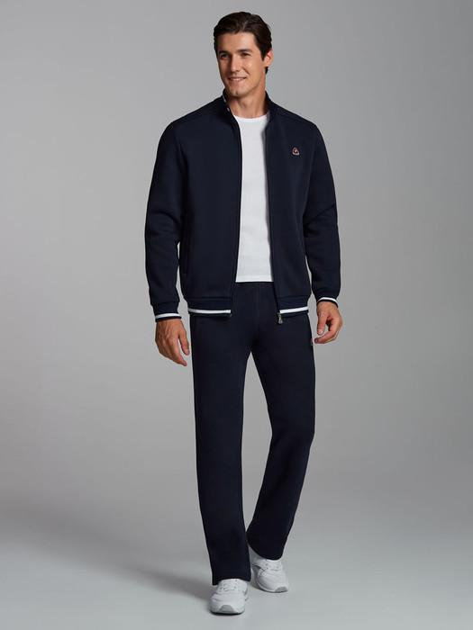 Спортивный костюм из толстого начесного трикотажного полотна. Куртка прямая с воротником с фронтальной молнией. Рукава втачные. Карманы куртки прорезные . На груди куртки слева и на левой брючине под карманом - фирменный шеврон.. Воротник, манжеты и пояс куртки выполнены из полосатого эластичного трикотажа. Брюки прямые, с прорезными карманами .Пояс брюк эластичный, по линии талии дополнительно регулируется шнурком.