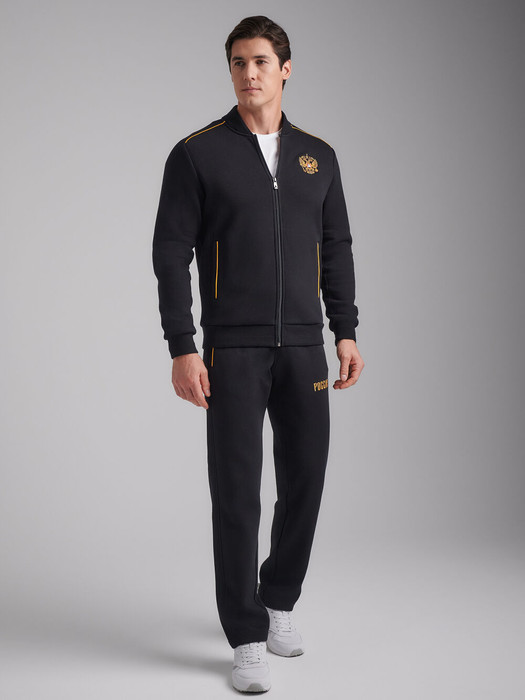 Спортивный костюм мужской, из хлопкового плотного трикотажа с начесом по изнанке. Куртка-бомбер свободного покроя, на поясе, с воротником, застегивается на молнию. Рукава покроя реглан, в плечевой шов реглана спереди вставлен золотистый кант. Прорезнные карманы куртки и брюк с планками, застегиваются на молнии. На спине куртки вышивка РОССИЯ, выполненная золотистыми нитями. На груди слева - вышивка герб РОССИИ. С левой стороны на брюках под карманом вышивка РОССИЯ. Пояс куртки, манжеты и воротник выполнены из плотного подвяза с рельефной полосой. Брюки прямые. Пояс брюк по линии талии с эластичной тесьмой дополнительно регулируется шнуром.
