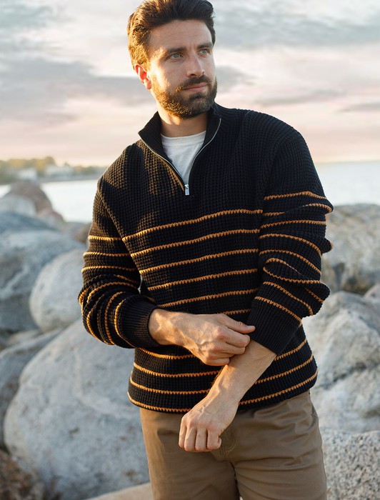 Состав: 60%Хлопок 40%ПАН (акрил) Параметры модели на первом фото: Рост 190, бюст 108, талия 87, бедра 104Свитер с узором полосы выполнен из хлопковой пряжи с добавлением акрила. Теплая модель фактурной крупной вязки с воротом, застегивается металлической молнией. Регулируя ворот можно носить с рубашками, футболками и водолазками. Кроме того, свитер совершенно не колется, поэтому его комфортно носить даже на голое тело. Внизу изделия нашивка бренда из эко-кожи.