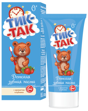 Особая мягкая очищающая система зубной пасты «Тик-Так» с ароматом клубники позволяет бережно ухаживать за полостью рта ребёнка, не повреждая структуру эмали молочных и первых постоянных зубов.