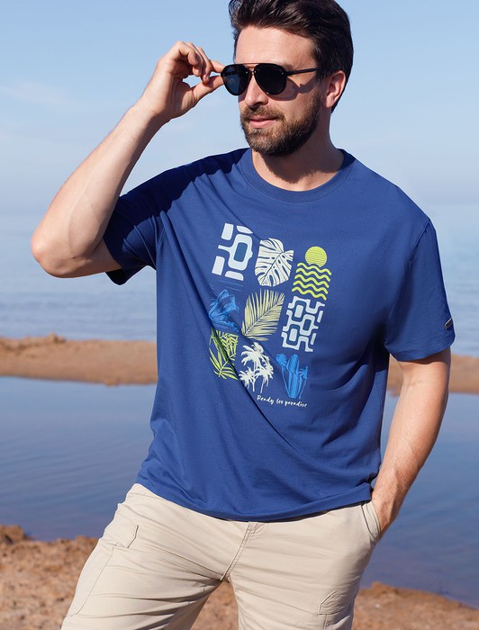 Состав: 92%Хлопок 8%ПУ Плотность: 170 Г/м2Перевод принта: Ready for paradise - готов к райскому отдыху. Футболка свободного кроя выполнена из премиального хлопка. Авторский принт нанесен красками с устойчивым покрытием. Благодаря эластану, носить изделие очень комфортно, и оно сохранит свой безупречный вид в течение долгого времени. На рукаве нашивка из эко-кожи с логотипом бренда.