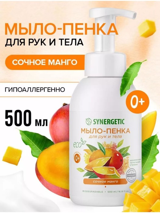 Мягкое жидкое мыло-пенка для рук и тела "Сочное манго" на основе натуральных компонентов бережно очищает кожу и оставляет приятный аромат сочного манго.