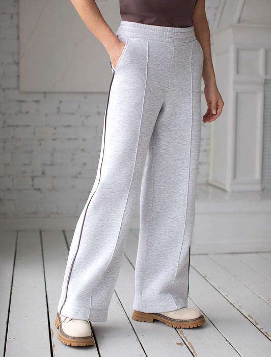 Состав: 80%Хлопок 20%ПЭ Плотность: 320 Г/м2Теплые прямые брюки серого цвета с эффектом меланж из эластичного футера трехнитки с начесом созданы для максимального комфорта в холодную погоду. Мягкий материал приятный к телу, хорошо держит форму, не вытягивается и не теряет форму даже при активной носке. Благодаря дышащим свойствам премиального футера, брюки подходят на любую погоду, обеспечивая оптимальный микроклимат и уют. Свободный крой и эластичный широкий пояс делает посадку удобной для разных типов фигуры и размеров, включая большие и маленькие. Застроченные стрелки визуально вытягиват силуэт и подчеркивают эстетичнось повседневных брюк, а контрастные тонкие лампасы добавляют актуальности образу. Благодаря особенностям трехниточного плетения и внутреннему слою с начесом, эти брюки отлично сохраняют тепло в холодные осенние и зимние дни, при этом в них вы будете выглядеть модно и современно. Вы можете составить комплект с артикулами: D49.143 и D49.142