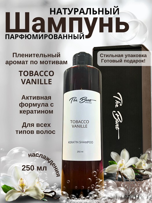 Натуральный парфюмированный шампунь The Bunt Tobacco Vanille бережно и эффективно очищает волосы и кожу головы, придает мягкость, блеск, окутывает локоны легким цветочным ароматом с нотами ванили и цветов табака.