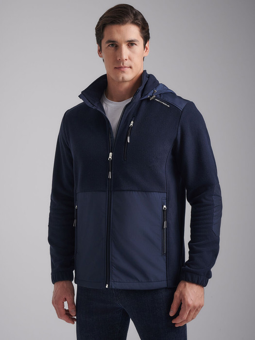 Толстовка мужская из флиса с капюшоном. Низ куртки и низ рукавов выполнены с эластичной рибаной. Толстовка с накладными карманами "кенгуру". Рукава "реглан". По всем швам выполнена отделочная строчка. По низу толстовки расположен, вдоль шва притачивания пояса настрочен шеврон с фирменным логотипом. В капюшоне расположены декоративные шнуры.