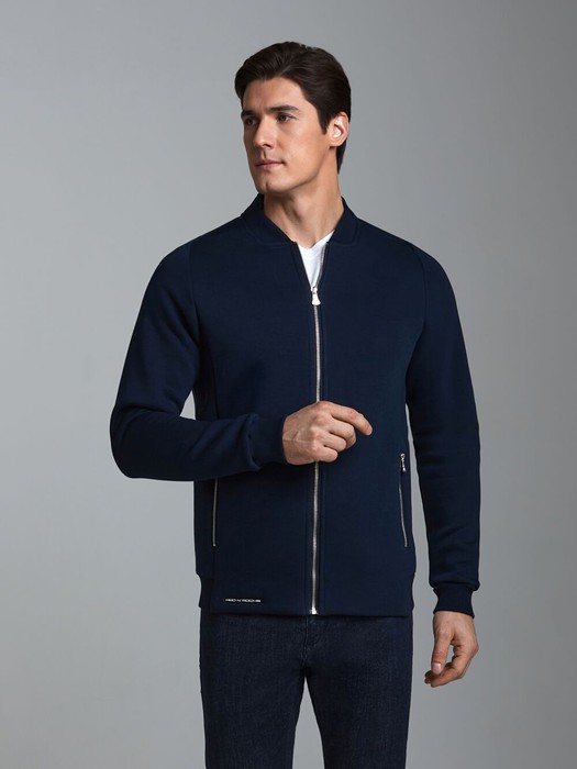 Толстовка изготовлена из плотного хлопкового трикотажного полотна с изнаночным начесом. Изделие на поясе, с воротником-стойкой, застегивается на молнию. Рукава комбинированного анатомического покроя. Вставки воротника, пояс и манжеты куртки изготовлены из плотной эластичной трикотажной резинки. Карманы прорезные, с молниями.