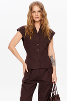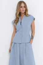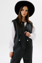 Жилет молодежный из трикотажного полотна «дабл-флис» (двухсторонний флис), прямого силуэта, с воротником «стойка», центральной бортовой застежкой на тесьму «молния». Для создания диагональных линий боковые швы переведены на полочку и оформлены в рельефные швы, в которых обработаны карманы.
