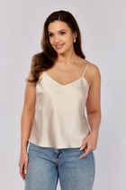 Блуза полуприлегающего силуэта. Выполнена из льняной (смесовой) ткани. Без рукавов, с открытыми плечами. Верх блузы на резинке. Верхняя часть лифа отрезная. По шву стачивания с нижней частью кулиса, в которую втянут шнур-завязка. Длина спинки 49 см