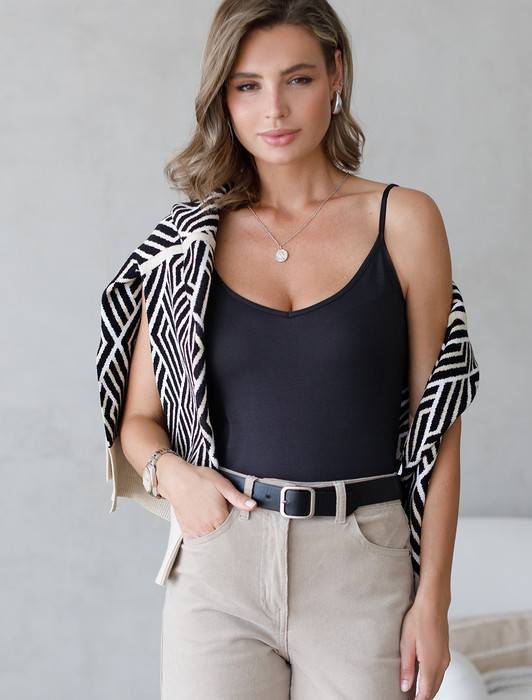 Состав: 92%Хлопок 8%ПУ Параметры модели на первом фото: Рост 170, бюст 89, талия 63, бедра 92 Размер товара на первом фото: 42Топ с V-вырезом выполнен из премиального хлопка. Модель дополнена регулируемыми бретелями, позволяющими носить изделие на нужном уровне. Эластичный материал гарантирует комфорт и формоустойчивость. Из украшений металлический логотип бренда.