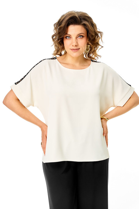 Блузка женская из текстильной ткани с цельнокроеным рукавом. Прямого силуэта. По спинке расположен подрез. В шов вставлено кружево. Рукав 3/4, низ рукава с манжетой. По плечевому шву  вставлено кружево. Вырез лодочка. Обработан притачной бейкой.