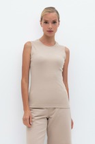 Топ эффектно смотрится благодаря вязке «английская резинка» и отлично пойдет для создания стильных образов.