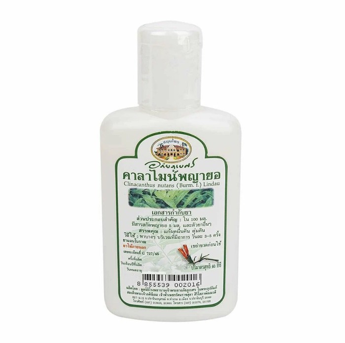 Травяной Тайский лосьон на основе только натуральных растительных компонентов эффективен при раздражении кожи, сыпи, укусах насекомыми, ветрянке, экземе, аллергических реакциях, прыщах и дерматите, герпесе, крапивнице, краснухе.
