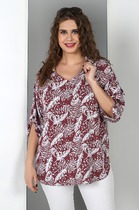 Туника женская, с однотонными кокетками на полочке и спинке, с погонами из основной ткани. Горловина круглая, рукав короткий. В боковых швах разрезы