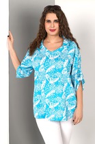 Туника женская, с однотонными кокетками на полочке и спинке, с погонами из основной ткани. Горловина круглая, рукав короткий. В боковых швах разрезы