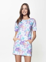 Туника прямого силуэта с коротким рукавом и круглым вырезом горловины. На полочке выполнена печать. От бедра по боковым швам расположены разрезы. С левой стороны через полукольцо продет декоративный шнур.