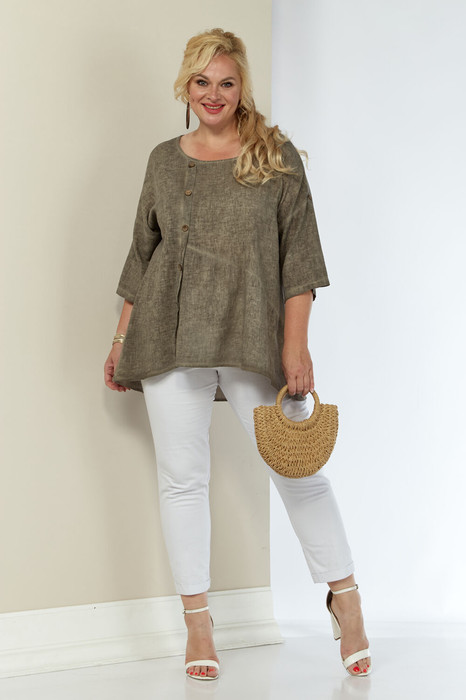 Женская льняная туника выполнена из высококачественного умягченного 100% натурального льна. Лён прошёл процедуру энзимного умягчения на производстве, поэтому туника не колется и не садится после стирки. Модель свободного силуэта к низу расширена, за счет подреза и легкой сборки по полочке. Вырез горловины округлой формы. По переду смещенная планка, декорированная пуговицами. Рукав трансформер, со спущенной линией плеча, регулируется при помощи паты и пуговицы. Спинка со средним швом. Низ изделия фигурный (спинка 76 см, перед - 59 см). Длина рукава от горловины 51 см.