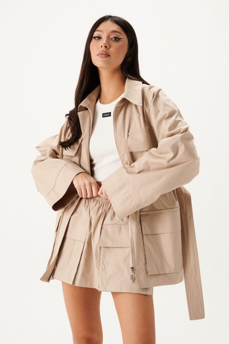 Юбка выполнена из текстильного полотна бежевого цвета, силуэт "трапеция". Характеристики: брендированная подкладка, пояс на резинке, по переду крупные функциональные накладные карманы.Длина 36см.