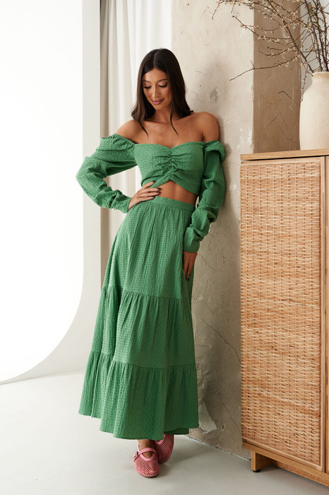 Юбка выполнена из текстильного полотна букле-венгерка зеленого цвета длины миди, на хлопковой подкладке.Состоит из трех ярусов, каждый из которых со сборкой по верху. В среднем шве заднего полотнища юбки обработана потайная застежка молния.Пояс юбки притачной, стабильный. Длина 93 см.