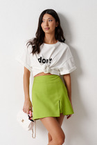 Юбка-мини. Выполнена из плотного текстильного полотна бежевого цвета. С подкладкой. Силуэт - трапеция. По всей окружности складки. Пояс стабильный. Застёжка пуговица и молния. В боковых швах карманы. Длина 43 см (с учётом пояса)