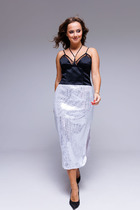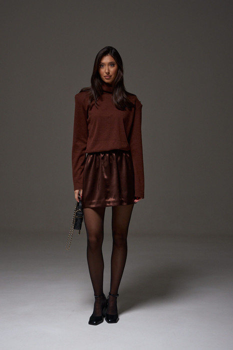 Юбка прямого кроя, выполнена из струящейся ткани коричневого цвета. Характеристики: прямой крой, на подкладке, пояс на резинке. Длина по боковому шву 42 см.