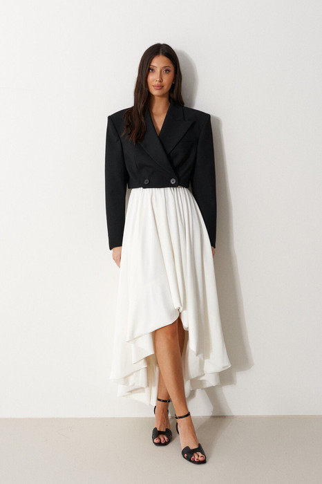 Юбка свободного кроя. Выполнена из сатиновой ткани молочного цвета. Пояс на резинке. Передняя часть юбки укорочена. Длина передней части по центру 54 см, длина задней части по центру 89 см