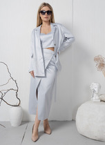 Юбка прямого силуэта, из текстильной ткани, верхний срез юбки обработан обтачкой, заднее полотнище со средним швом, застегивается на потайную молнию. Шов переходит к низу в шлицу. По переднему и заднему полотнищах обработаны таливые вытачки. Длина по боковому шву 66 см. Юбка на подкладке.