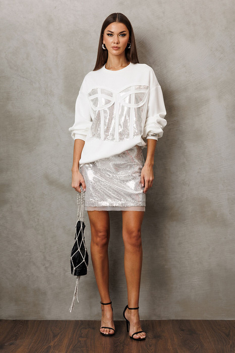 Юбка А-образного силуэта из пайеток, вверху на обтачке. С застежкой в боковом шве на металлическую тесьму-молнию. По задней половинке юбки вытачка. Юбка без на подкладке.
