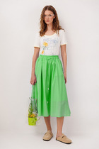 Юбка А-образного силуэта, на притачном отстроченном поясе на резинке и вставленным в него шнурком из основной ткани с наконечниками. Юбка на подкладке из основной ткани и карманами в боковом шве.