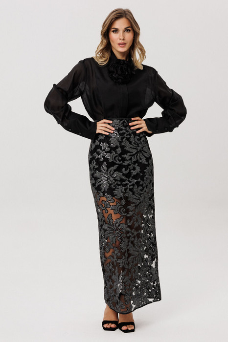 Юбка выполнена из сетки с вышивкой с пайетками. Юбка прямого силуэта,  длиной миди. Юбка на притачном поясе, застегивающимя на петлю и пуговицу и на потайную молнию сзади в среднем шве. Юбка без подкладки.