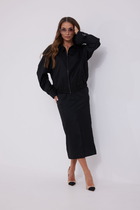 Юбка слегка зауженная к низу, на широком поясе, эластичном в области спинки, с наклонными боковыми карманами, застежкой и шлицей по центру передних половинок. Длина юбки в р.46-48 около 55 см, в р.50-52 около 58 см.