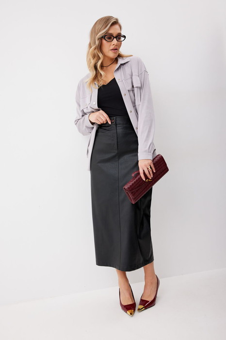 Юбка-карандаш женская из искусственной кожи. Длина юбки до середины икры. По переду в юбке обработаны карманы с отрезным бочком, по концам кармана установлены хольнитены. Перед юбки с центральным швом, в котором обработан гульфик с застежкой – молнией. Спинка юбки со средним швом в котором располагается разрез. Верх спинки юбки с отрезной фигурной кокеткой и вытачками. Верхний срез юбки обработан отрезным поясом, с резинкой по спинке и шлевками. Пояс застегивается на кнопку.