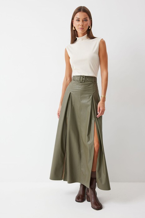 Стильная юбка А-силуэта из экокожи , длины макси. По верху юбки притачной пояс с шлевками для ремня. На передних половинках расположены вытачки со встречной складкой и разрезами по низу. На задних половинках расположены талиевые вытачки. На спинке по центру потайная молния. В комплект входит ремень.