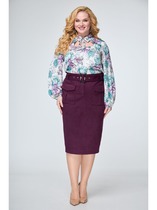 Юбка прямого силуэта длиной миди. Левая вытачка на переднем полотнище переведена в вертикальный шов, в котором от середины бедра оформлена шлица. На заднем полотнище две пары вытачек и средний шов. Пояс притачной.