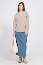 Ярким, экстравагантным и практичным элементом женского образа является юбка из экокожи. Юбка слегка расширенная к низу, по переду полотнищ расположена ассиметричная планка с кнопками. Верхний срез юбки обработан обтачкой. Длина юбки мидакси.