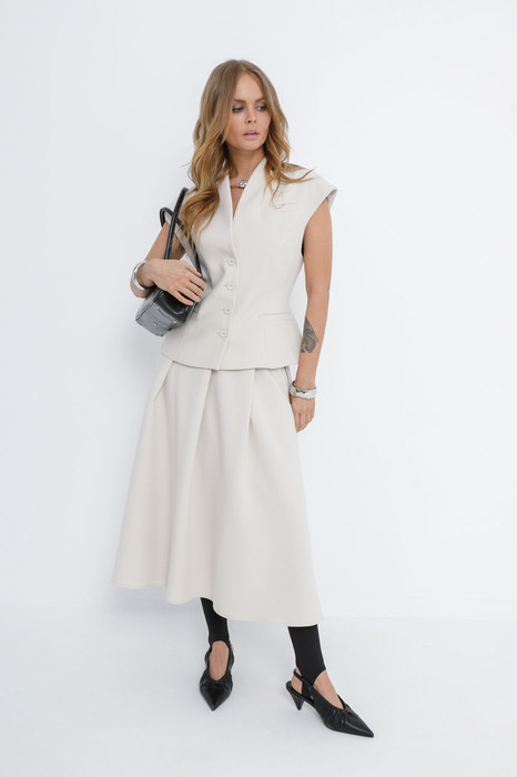 Детали: юбка на притачном поясе со шлевками, прорезные карманы, застежка на потайную молнию в левом боковом шве, на подкладке.