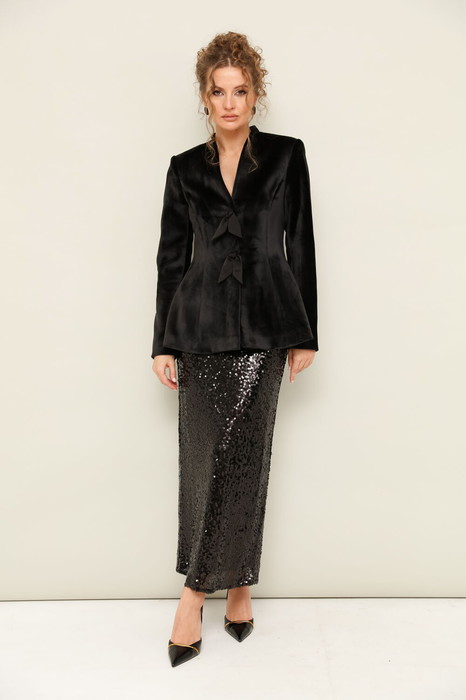 Прямая юбка из велюра с пришитыми во верху пайетками. Пояс юбки на резинке. Юбка на подкладке, сзади разрез для свободы движения.