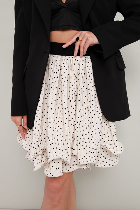 Юбка в длине мини, выполнена из ткани с мелкой плиссировкой. Притачной пояс на резинке. Низ юбки обработан с использованием лески для создания эффектного края.