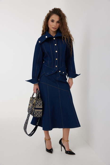 Юбка женская из джинсовой ткани, длиной миди, силуэта «рыбка». Пояс притачной со шлевками под ремень, застежка на молнию и джинсовую пуговицу, по переду боковые карманы, по спинке талиевые вытачки и средний шов. Юбка имеет фигурный наклонный подрез, нижняя часть юбки от подреза из 8-ми клиньев, которые создают силуэт. Все швы отстрочены контрастными нитками. Длина без пояса - 80 см.