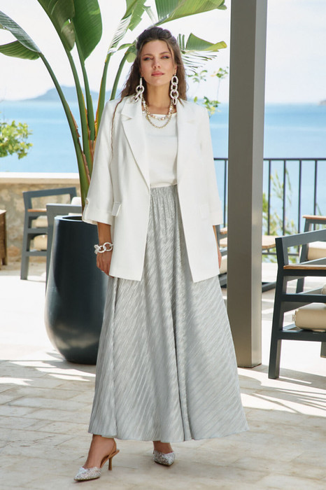 Юбка «полусолнце» в длине миди с жатой фактурой — это сочетание лёгкой драматичности и непринуждённой элегантности. Её силуэт создаёт мягкую визуальную волну, а жатая поверхность превращает каждый изгиб в игру света и тени: она одновременно утончённая и характерная, романтичная и по-городски современная. Из-за сжатой фактуры ткани юбка выглядит живой и объёмной.