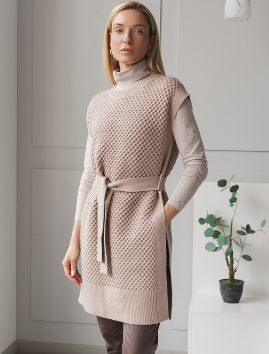Состав: 52%ПАН (акрил) 33%ПЭ 8%ПУ 7%Кашемир Размер товара на первом фото: 42Удлиненный жилет выполнен из мягкой пряжи с кашемиром. Модель фактурной вязки дополнена высокими боковыми разрезами и поясом в тон изделия. Хорошо сочетается водолазками, лонгсливами и блузками. Мягкая пряжа очень приятная к телу, поддержит комфорт на протяжении всего дня, при этом не перегревая. Сочетается в костюме с брюками D38.013, D38.012 и юбкой D36.016