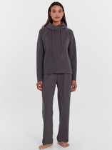 Пояс регулируется вязаным шнуром в тон брюк. Плотная фактура вязания согревает и сохраняет форму во время носки.